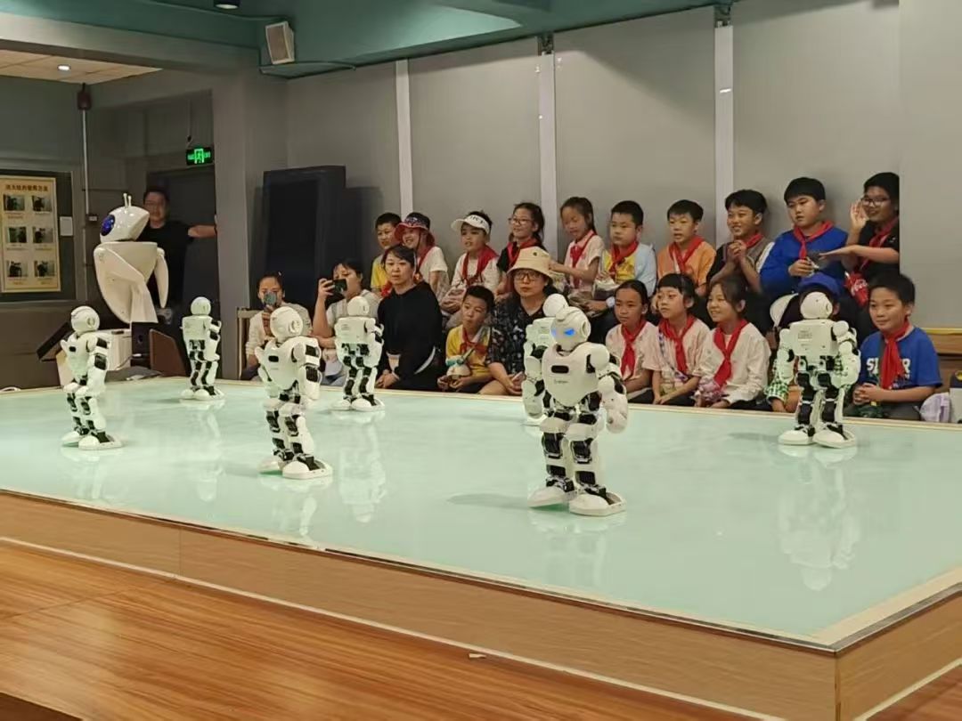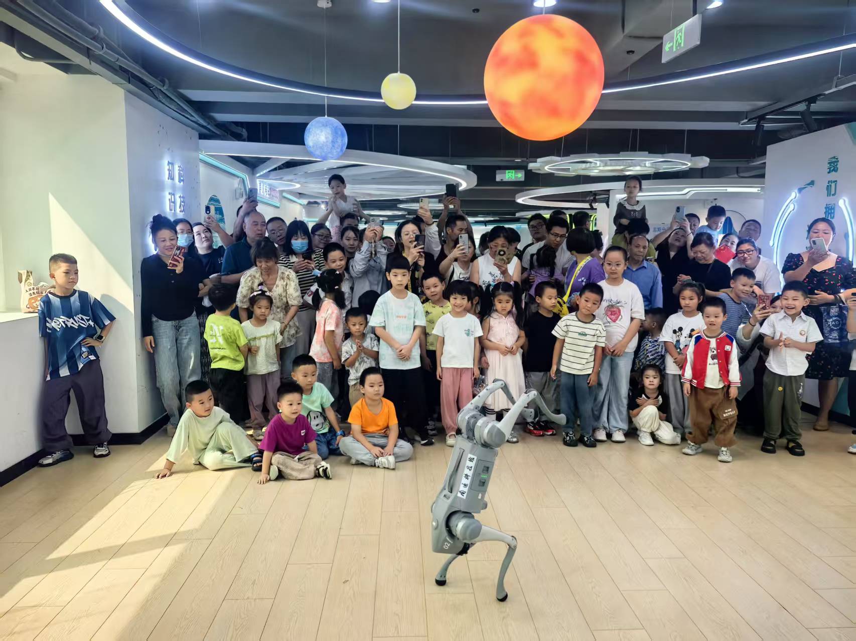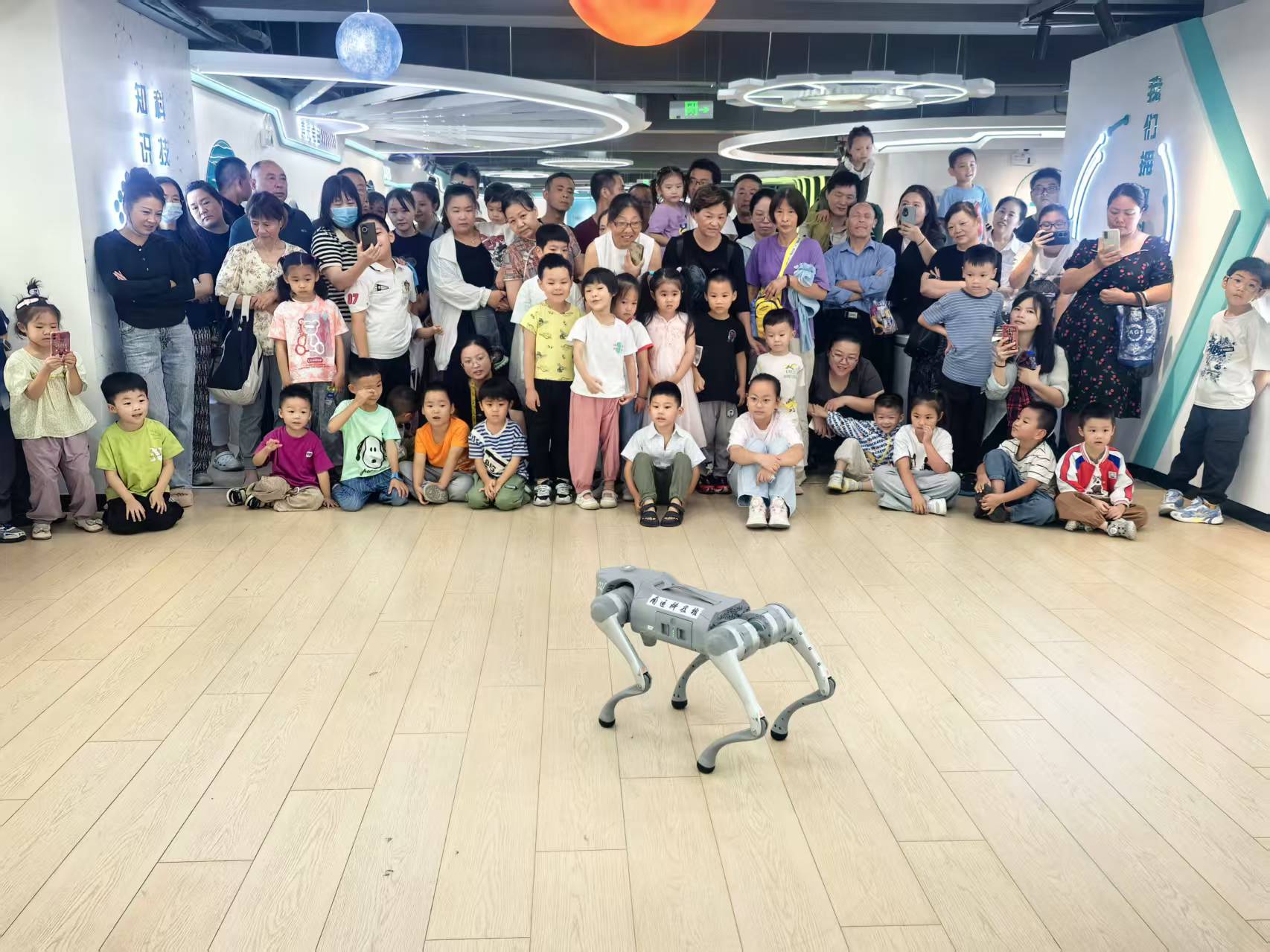 科技馆科技展厅化身“机器人舞台”,上演多场科技与艺术的碰撞。精彩绝伦的舞蹈机器人表演、沉浸式 VR 体验,瞬间吸引了小朋友们的目光。机器狗才艺秀,四足机器人“钢铁汪星人”随音乐节奏完成跳跃、转圈等高难度动作,甚至与现场观众玩起“指令互动”,引得阵阵喝彩。人形机器人“科小通”与萌宠机器人展开“全能挑战”,从挥手致意到深蹲站着起,展现精准的机械臂操作与AI识别能力,现场观众直呼“未来已至”。